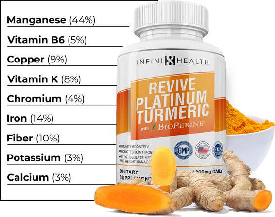 While Revive Platinum Turmeric is packed with over 300 naturally occurring vitamins and minerals such as calcium, potassium, beta-carotene, vitamin C, zinc, niacin and flavonoids...